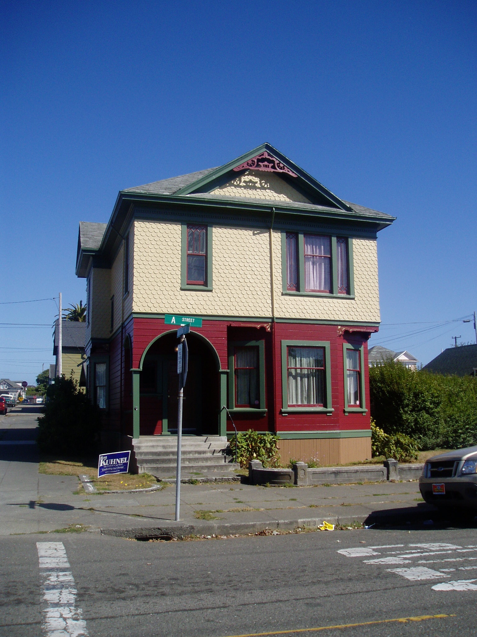 This is the house at 903 A Street that was our first home in Eureka. It was part of the abandoned freeway right-of-way between 7th and 9th streets. When Caltrans realized they were never going to build the freeway right through the middle of town that they had originally contemplated, they put this home, along with about 60 others on the auction block. We purchased this 2200 square foot home, built in 1904, in a sealed bid auction. It was a delightful home, and we still own it. It is rented to relatives. The photo above was taken when we purchased it in 1998. We painted the house in 2006 and the photos below show the way it looks now. |