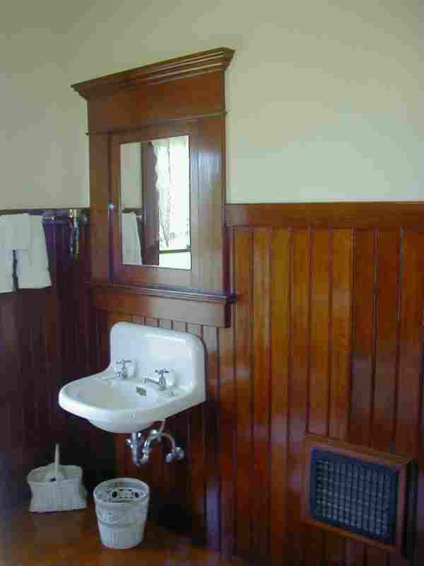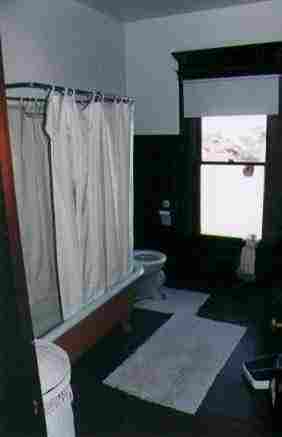 Photo Number 1: This is bathroom before any work was begun. The ceiling was painted white, and the floors and wainscoting was covered with polyurethane that was yellowing and cracking. |