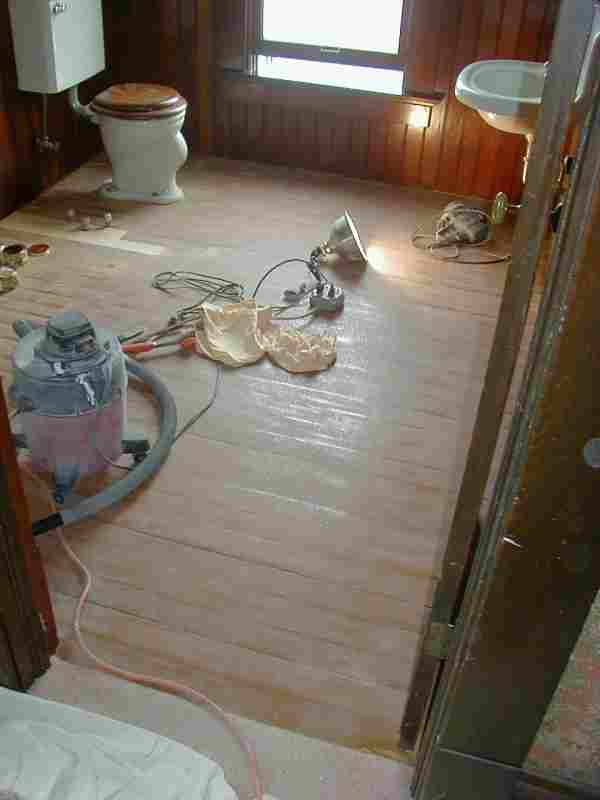 Photo Number 3: The stripping of the old finish has begun. Regretfully it was necessary to replace some boards next to the head of the tub (Done by Wise Flooring). In restoration every effort is made to preserve old materials. |