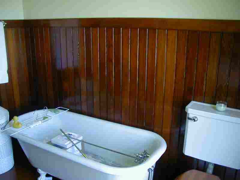 Photo Number 4: The wall behind the tub has received its first couple of coats of shellac. Notice the original beauty of the redwood wainscoting is now showing through. The ceiling and upper walls have been retextured are are ready for painting. |