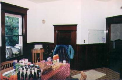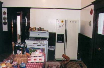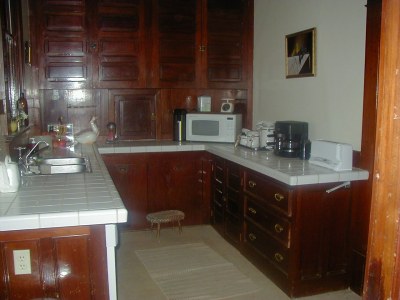 The other kitchen is the service kitchen. It is longer and narrower, and contains the sink, dishwasher, and counters. It has many cabinets, all of which are original, made of redwood, and in excellent. In the 1990's the original wooden counters were removed and replaced with modern tile, and a stainless steel sink. The long-term goal is to replace the modern counters with wooden counters and an appropriately styled sink more in keeping with the 1908 restoration theme.