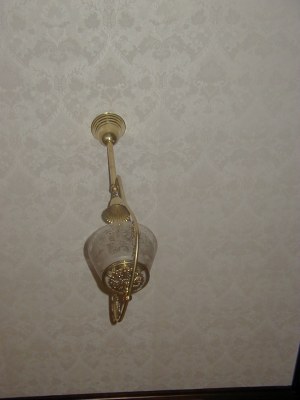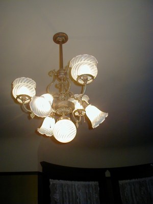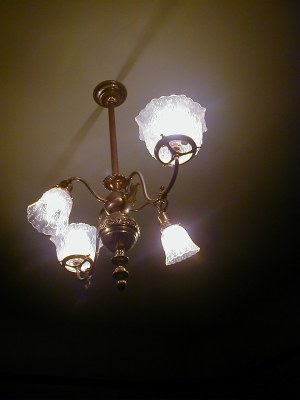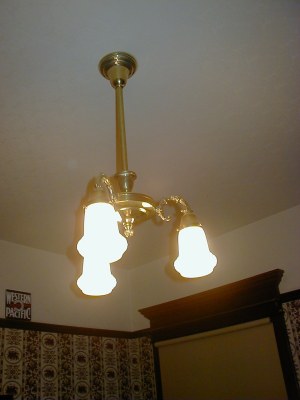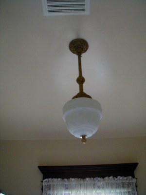 | Below are photos of some of the new lighting installed in the house. These are mostly approximately circa 1900 gas fixtures that have been electrified, or recreations using mostly old parts, and most have antique glass shades. |