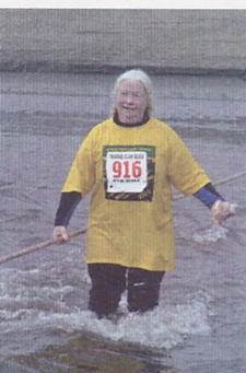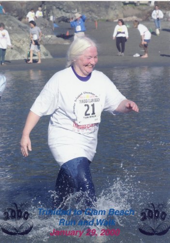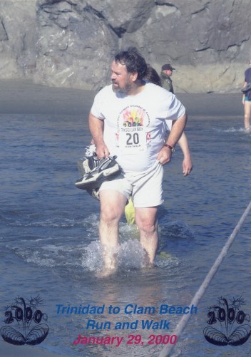 | This the 2001 Trinidad to Clam Beach Run/Walk, again at the river crossing. This time Ron did not take off his shoes for the river crossing and beat Melanie to the finish by over 5 minutes. |