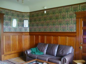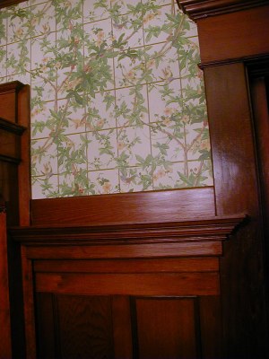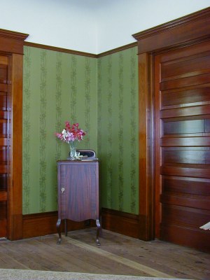 Entry and hallway This is a photo taken from the Carter and Company website of the paper, known as "Garfield Hall Wall" that will be hung in January 2002 in our entry and hallway. This same wallpaper, which is originally from the James A. Garfield Historic Site in Mentor, Ohio also hangs in a room in the Carson Mansion in Eureka, CA |