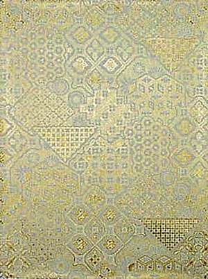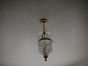 Master Bedroom Ceiling The master bedroom ceiling paper is called "textured mica", and is from the Cohen-Bray House in Oakland, California. It is shown here with the Waterford chandelier. |