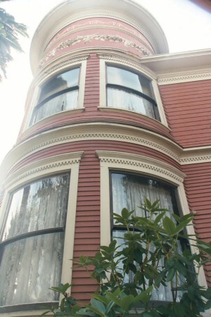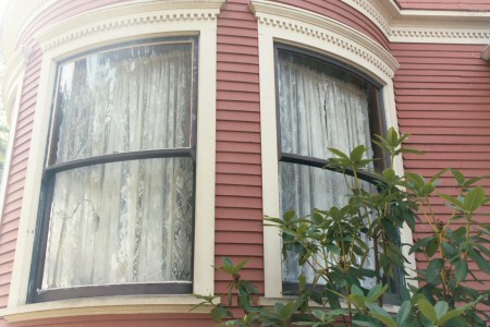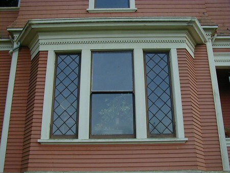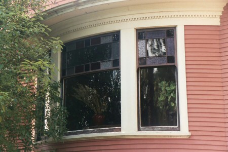 There are quite few large, curved glass windows in the house. Some had been replaced by plastic. We had new curved glass panes made, and installed. Below are some of them on the turret and dining room, and another other interesting window on the library. The glass is far superior to the plastic, which yellows with age.