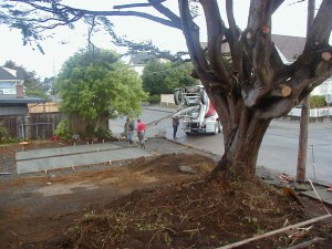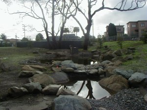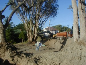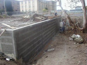 At one one time a deep creek bed ran through the property. It had been filled in with 15,000 cubic yards of soil in anticipation of the construction of apartments on the site. The firm of Natzler and Cunningham Designs was retained to do a concept plan for the site. This concept plan incorporated a large pond at the south end, smaller ponds in the middle, and another pond at the bottom of the creek behind the Zanone house, all joined by a waterway fed by re-circulating pumps. Graceco Construction removed 5,000 cubic yards of fill, built a three foot thick, eight foot high, and 55 foot long retaining wall and cistern at the south end, and did a variety of other work to build a concrete wall next to the existing driveway, straighten walls, reconstruct sidewalks, move a driveway, and pour a duplicate of a wall across the front. The requirement was the new work be made to duplicate the concrete finish and color of the nearly 100 year old walls and walks. They were highly successful and the finished product was remarkable.