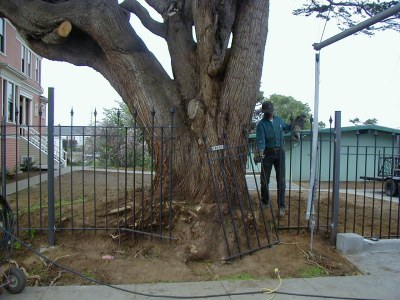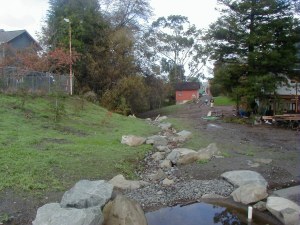 On the south end the old creek bed was excavated, the "great wall" built, trees pruned, 40 redwoods planted, and the pond roughed out. On the north end a new driveway was constructed and new landscaping installed.