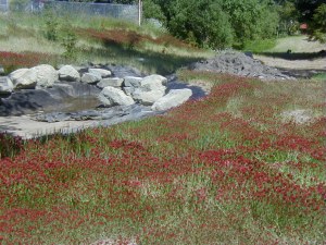 The ponds are running, the ground is seeded with native grasses and wildflowers, and everything is green.