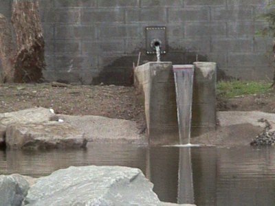Close-up of cistern outlet and flume, with water spilling into main pond. |